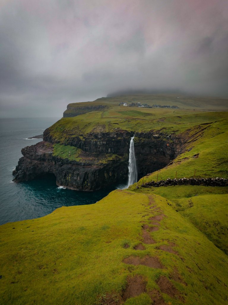 2. Gásadalur: Een pittoresk dorpje gelegen in een afgelegen vallei op het eiland Vágar. Het staat bekend om de Múlafossur-waterval die van de kliffen naar beneden stort en uitkomt in de zee. Het is een van de iconische bezienswaardigheden van de Faeröer Eilanden.